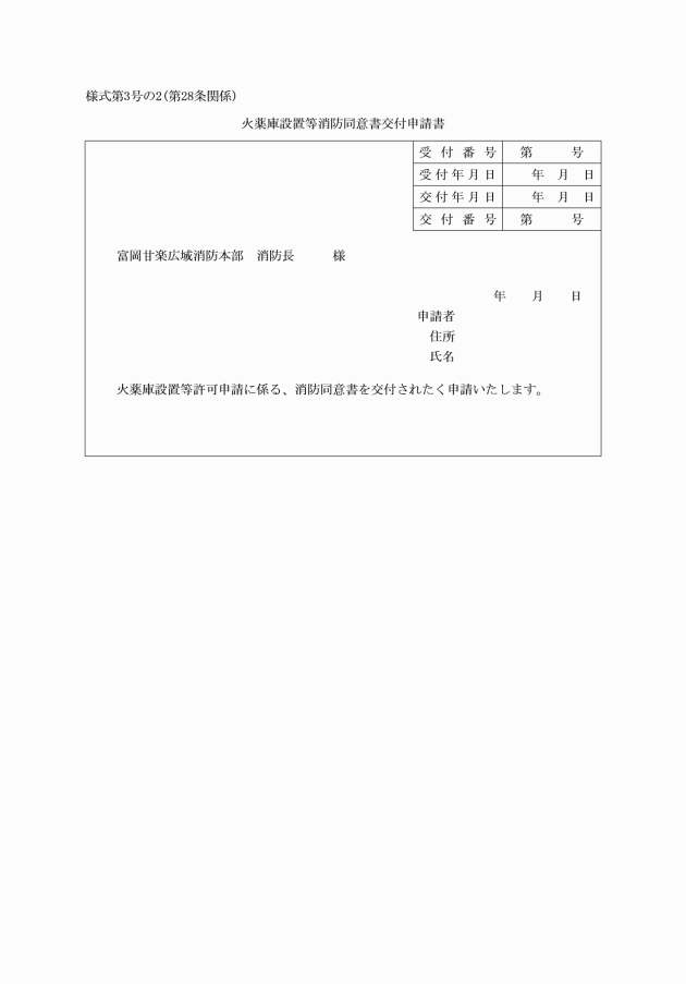 第28条 火薬庫設置等に伴う同意書交付申請は、様式第3号の2の同意書交付申請書に火薬庫設置等許可申請書類を添え申請させるものとする。