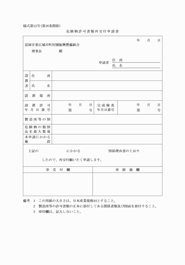 第16条 法第11条第1項の規定により、製造所等の設置又は変更の許可を受けた者(法第11条第6項の規定により設置者の地位を承継した者を含む。)は、許可書類を亡失し、滅失し、汚損し又は破損したときは、様式第12号の申請書に理由書を添付して理事長に許可書類の再交付を申請することができる。