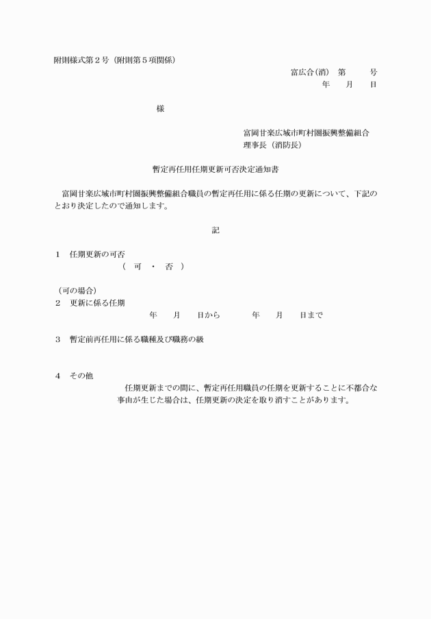 6 理事長又は消防長は、前項に規定する任期の更新の可否を決定したときは、当該職員に暫定再任用任期更新可否決定通知書(附則様式第2号)により通知するものとする。