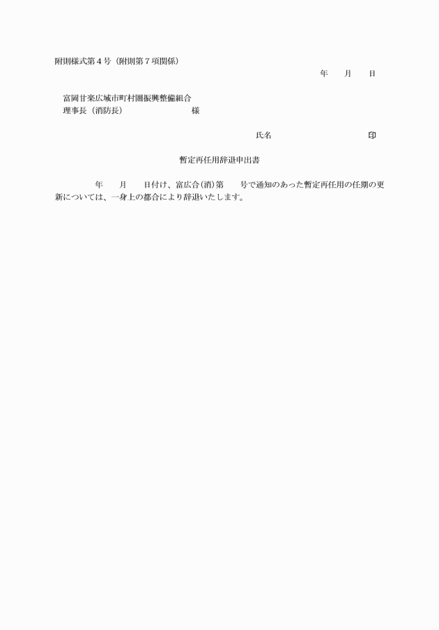 8 暫定再任用任期更新職員は、任期の更新を辞退する場合は、理事長又は消防長に暫定再任用辞退申出書(附則様式第4号)を提出するものとする。