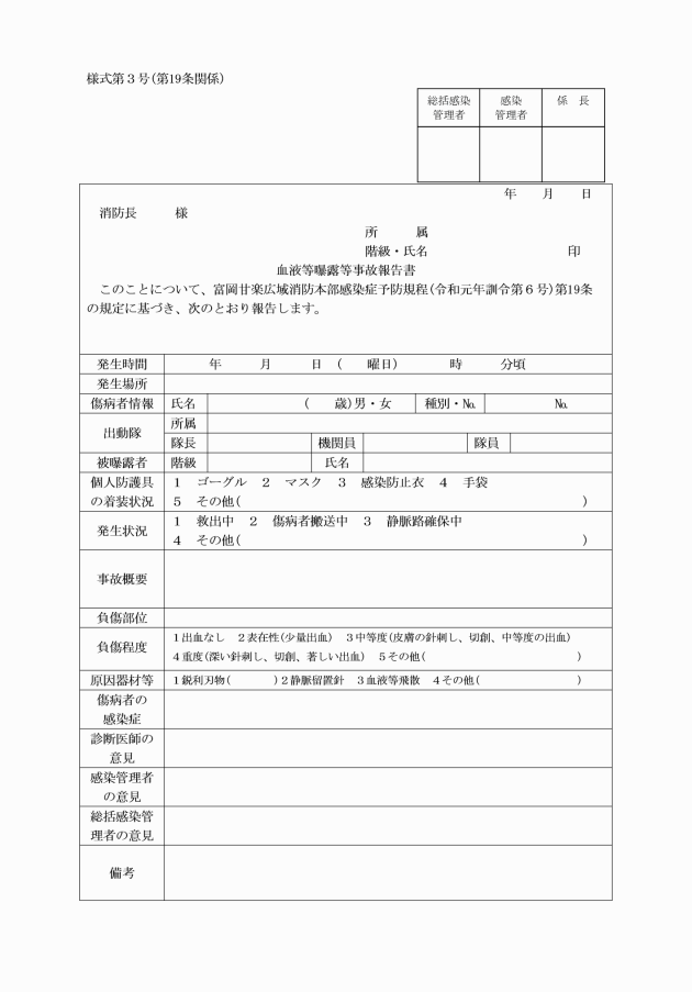 第19条 現場活動において、隊員等に血液等曝露事故が発生したときは、隊長は搬送先医療機関の医師に感染予防に関し口頭で指示及び助言を求め、その内容を速やかに口頭及び様式第3号による報告をしなければならない。