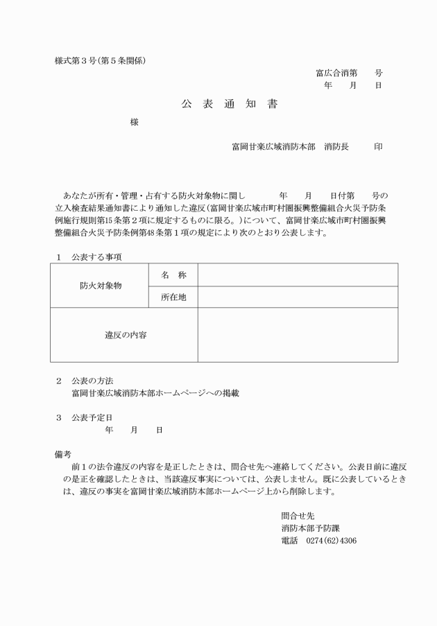 第6条 消防長は、公表該当違反が公表予定日までに是正されないときは、公表事項を富岡甘楽広域市町村圏振興整備組合消防本部ホームページに公表するものとする。